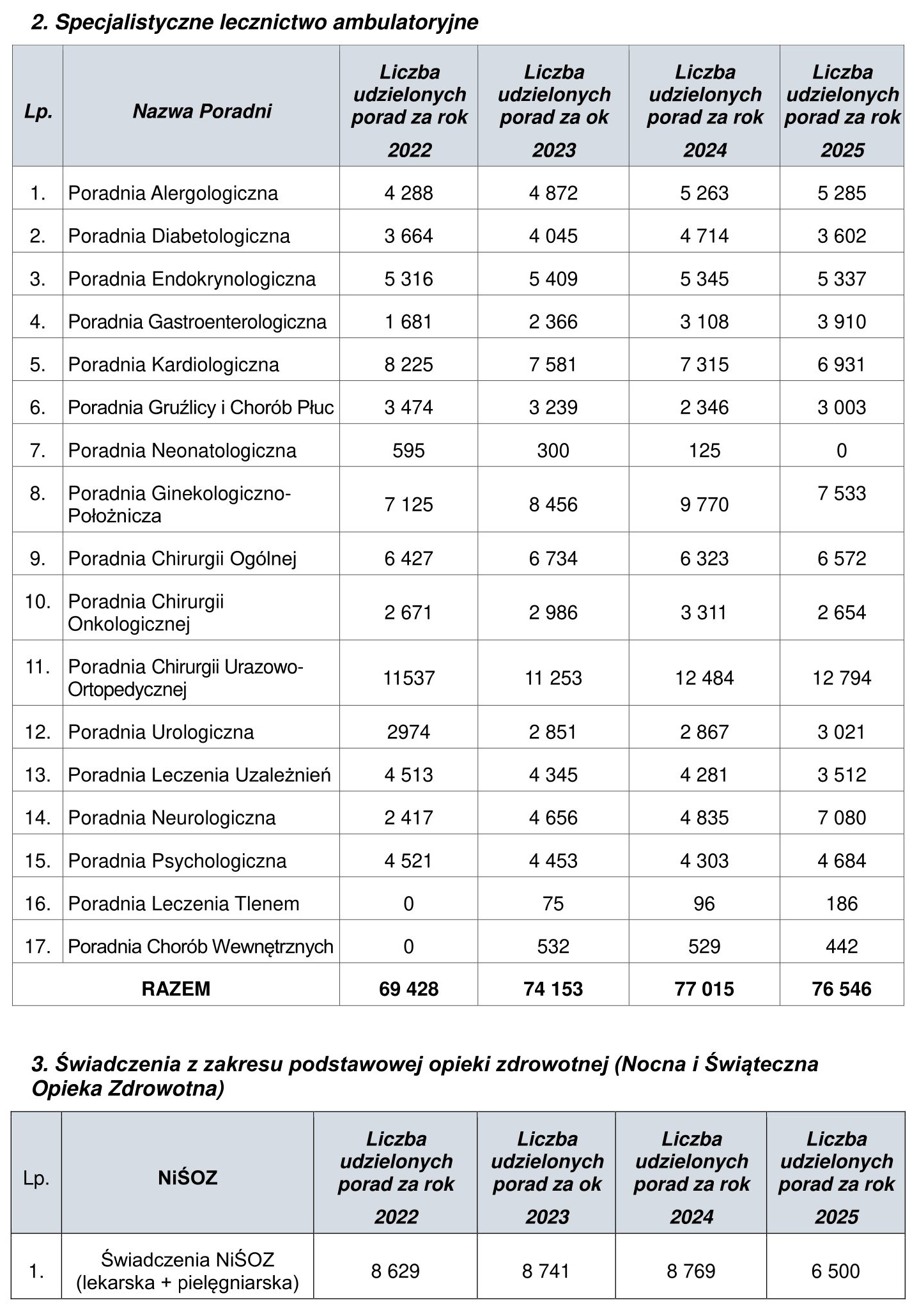W 2025 roku szczególny nacisk położono na utrzymanie ciągłości udzielanych świadczeń, poprawę organizacji pracy oraz stopniowe unowocześnianie zaplecza medycznego i technicznego. Podejmowane działania miały na celu nie tylko zwiększenie dostępności usług, ale również poprawę jakości leczenia i komfortu pacjentów.