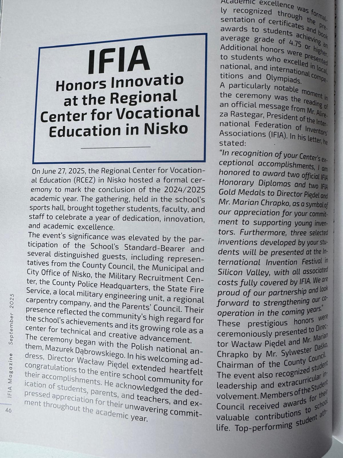 W najnowszym wydaniu IFIA Magazine No. 21 ukazał się artykuł poświęcony Regionalnemu Centrum Edukacji Zawodowej w Nisku. Publikacja podkreśla znaczące osiągnięcia szkoły w dziedzinie innowacji, kreatywności i edukacji technicznej, a także współpracę z Międzynarodową Federacją Stowarzyszeń Wynalazców (IFIA).