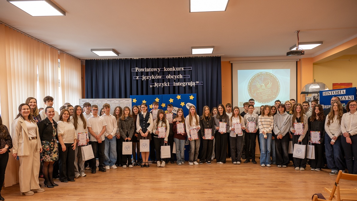 W czwartek, 26 marca 2026 roku, w auli Zespołu Szkół w Jeżowem odbyła się kolejna edycja Konkursu z Języków Obcych „Języki integrują”. Czternasta edycja Konkursu przyciągnęła liczne grono uczestników – w obu kategoriach językowych wystartowało łącznie aż 16 drużyn.