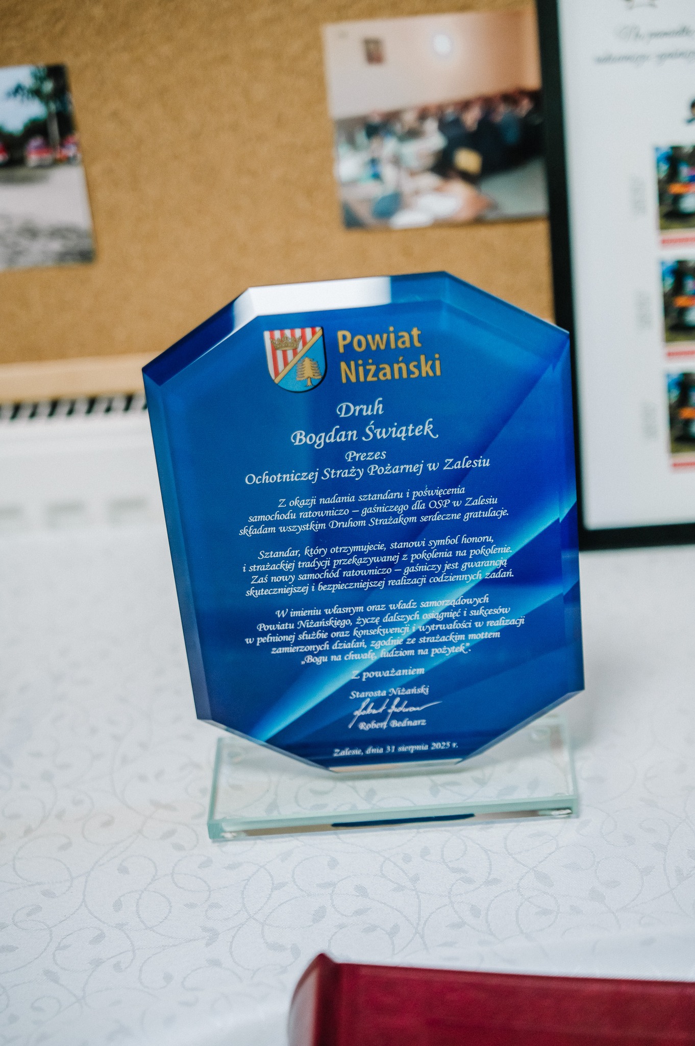 Powiat Niżański na uroczystości reprezentował Starosta Niżański Robert Bednarz, który na ręce Prezesa Ochotniczej Straży Pożarnej w Zalesiu – Druha Bogdana Świątka, przekazał pamiątkowe szklane trofeum. - Sztandar, który otrzymujecie, stanowi symbol honoru, i strażackiej tradycji przekazywanej z pokolenia na pokolenie. Zaś nowy samochód ratowniczo – gaśniczy jest gwarancją skuteczniejszej i bezpieczniejszej realizacji codziennych zadań. W imieniu własnym oraz władz samorządowych Powiatu Niżańskiego, życzę dalszych osiągnięć i sukcesów w pełnionej służbie oraz konsekwencji i wytrwałości w realizacji zamierzonych działań, zgodnie ze strażackim mottem „Bogu na chwałę, ludziom na pożytek” – mówił Starosta.