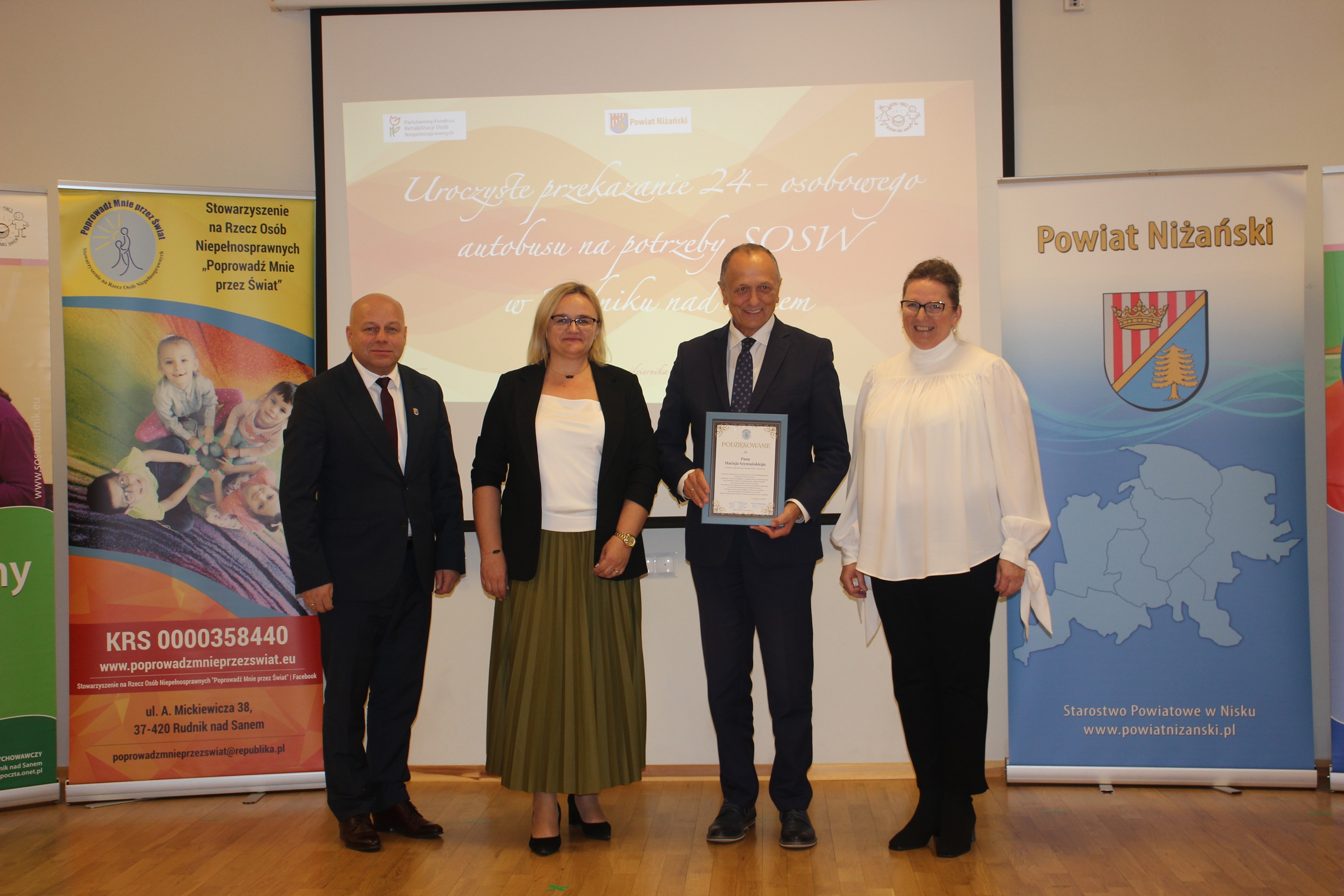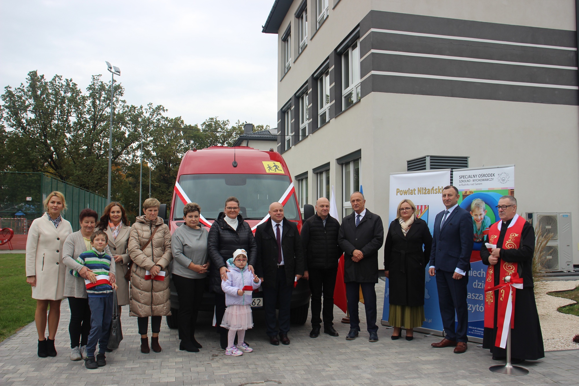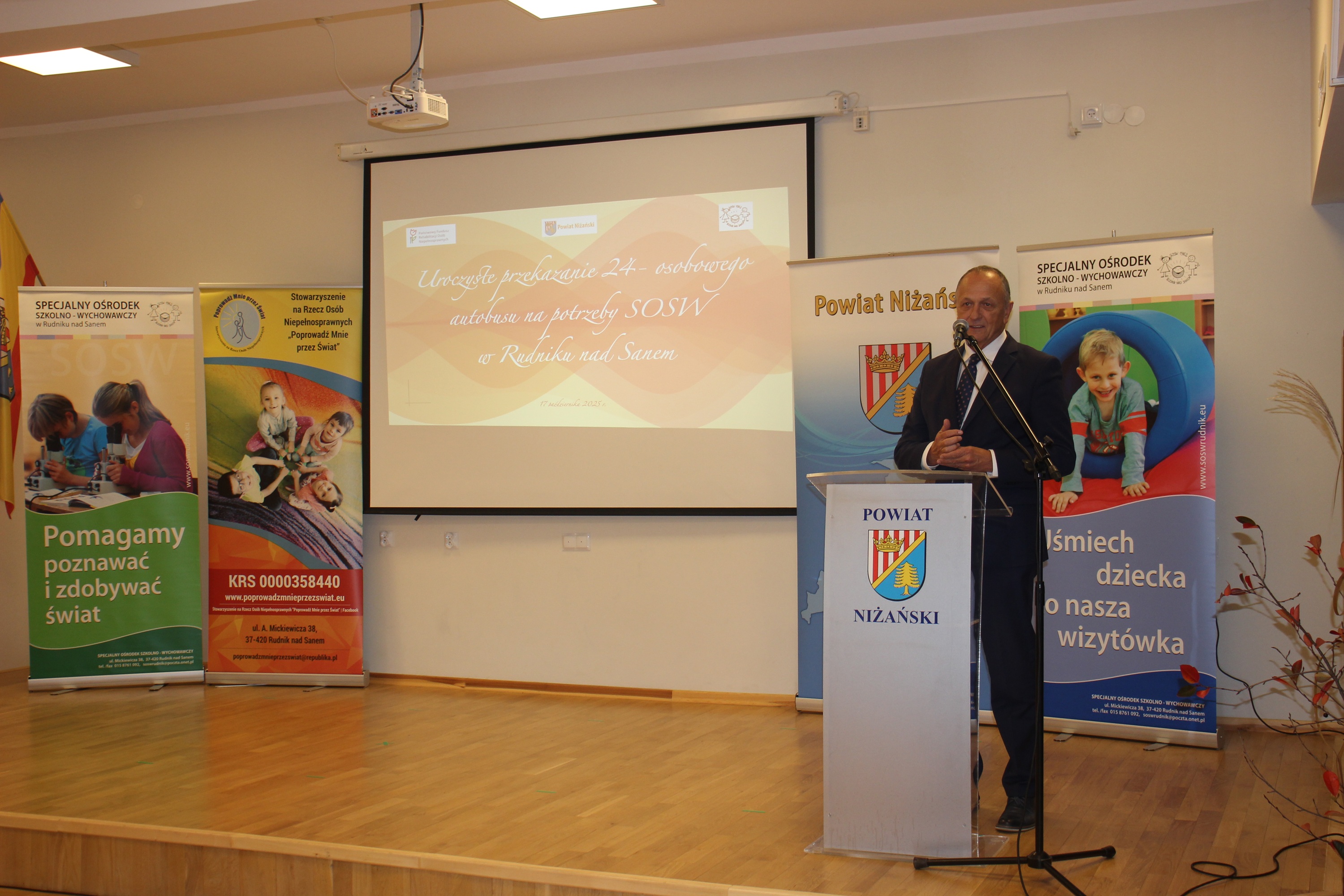 W piątek, 17 października 2025 roku, w Specjalnym Ośrodku Szkolno-Wychowawczym w Rudniku nad Sanem odbyła się uroczystość przekazania 24-osobowego autobusu, który od tej pory będzie służył uczniom i pracownikom placówki. W wydarzeniu wzięli udział m. in. Starosta Niżański Robert Bednarz, Dyrektor Oddziału Podkarpackiego PFRON w Rzeszowie Maciej Szymański oraz Ksiądz Dziekan Stanisław Czachor Proboszcz Parafii Trójcy Świętej w Rudniku nad Sanem.