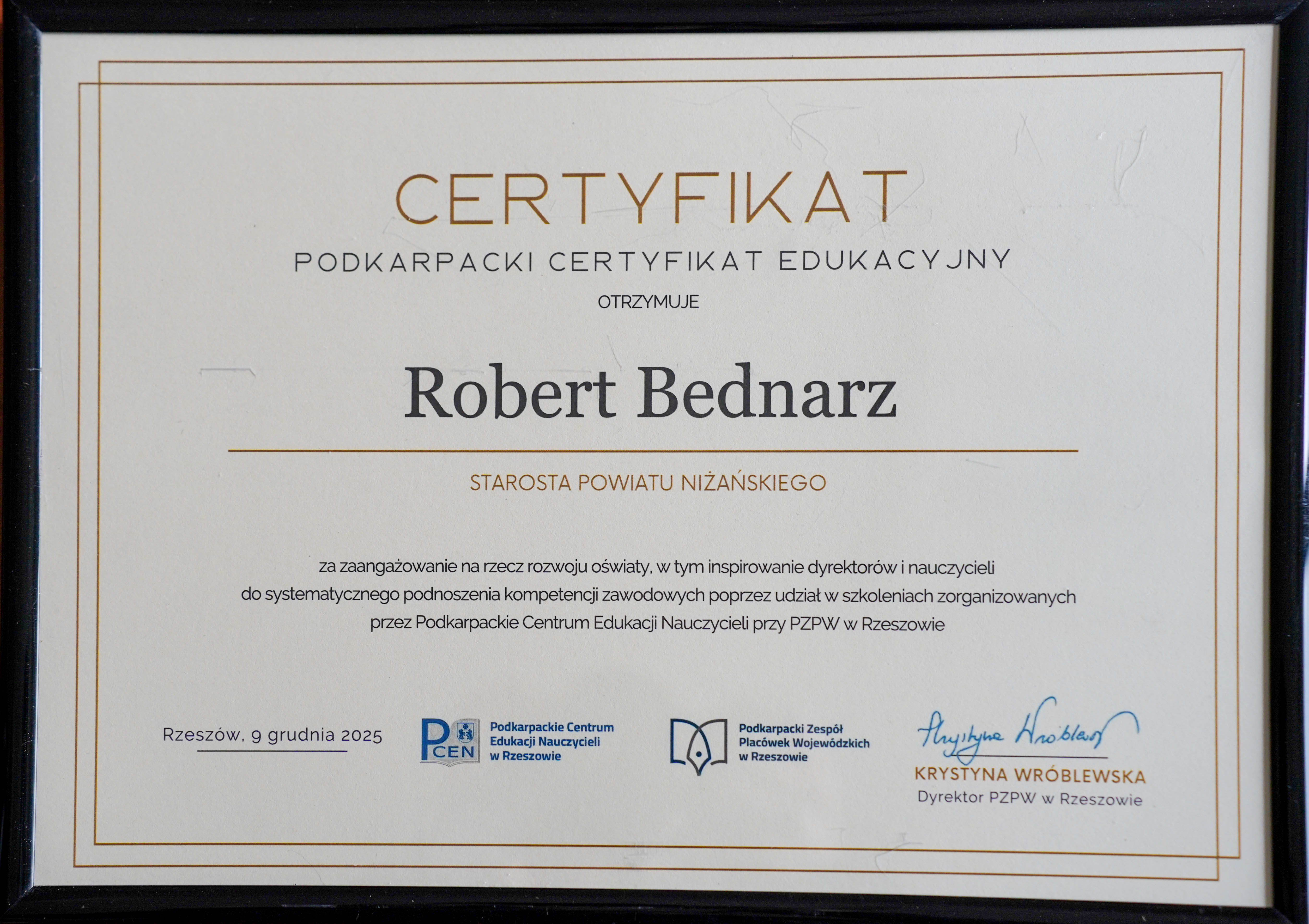 We wtorek, 9 grudnia br., w sali audytoryjnej Urzędu Marszałkowskiego Województwa Podkarpackiego odbyła się IV Gala wręczenia Podkarpackiego Certyfikatu Edukacyjnego oraz Certyfikatu Podkarpackiej Akademii Innowacji Pedagogicznych. Podczas uroczystości uhonorowano osoby i instytucje szczególnie zasłużone dla rozwoju oświaty w regionie. W gronie wyróżnionych znalazł się Starosta Niżański Robert Bednarz, który odebrał certyfikat przyznany za konsekwentne działania na rzecz podnoszenia jakości edukacji w województwie podkarpackim.