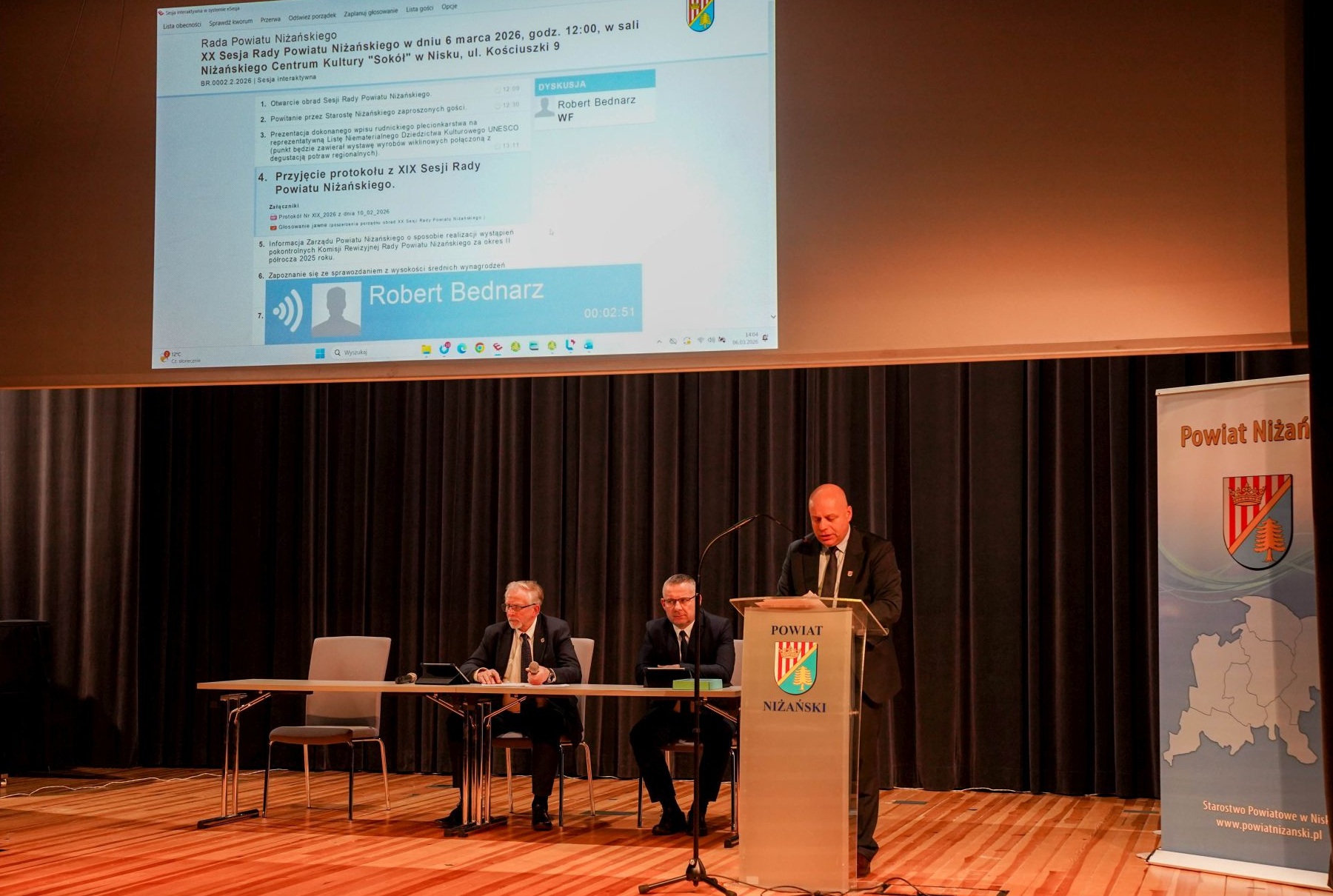 Dnia 6 marca 2026 r. w sali widowiskowej Niżańskiego Centrum Kultury w Nisku, odbyła się XX Sesja Rady Powiatu Niżańskiego, zwołana przez Przewodniczącego Rady Powiatu Niżańskiego Sylwestra Daśko. Po otwarciu obrad przez Przewodniczącego Rady oraz powitaniu zaproszonych gości przez Starostę Niżańskiego Roberta Bednarza, Burmistrz Gminy i Miasta Rudnik nad Sanem Tadeusz Handziak oraz Dyrektor Miejskiego Ośrodka Kultury Anna Straub uroczyście zaprezentowali wpis plecionkarstwa polskiego na Listę Reprezentatywną Niematerialnego Dziedzictwa Kulturowego Ludzkości UNESCO.