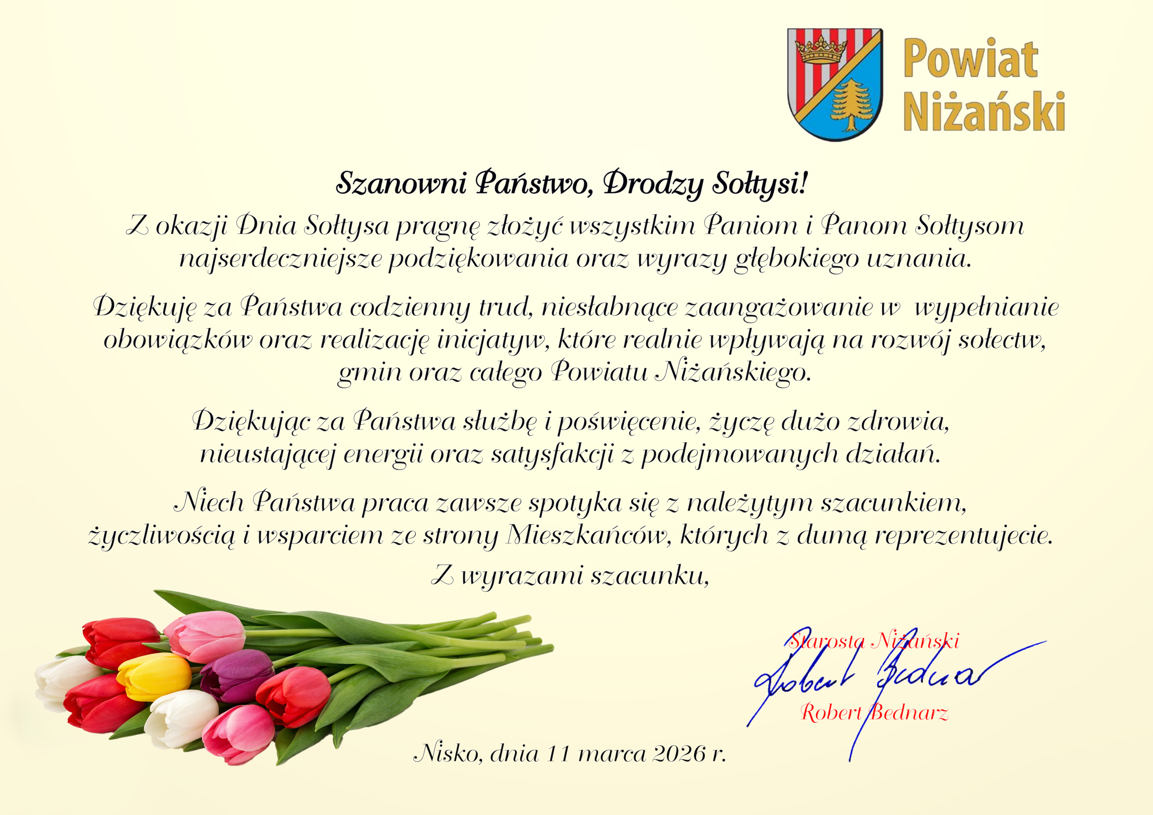 Informujemy, że w sprawie ustanowienia i przyznawania dorocznych nagród Starosty Niżańskiego za osiągnięcia w dziedzinie twórczości artystycznej, upowszechniania i ochrony kultury, do dnia 31 marca 2026 r. można składać wnioski o przyznanie dorocznej nagrody Starosty Niżańskiego za osiągnięcia w dziedzinie twórczości artystycznej, upowszechniania i ochrony kultury.