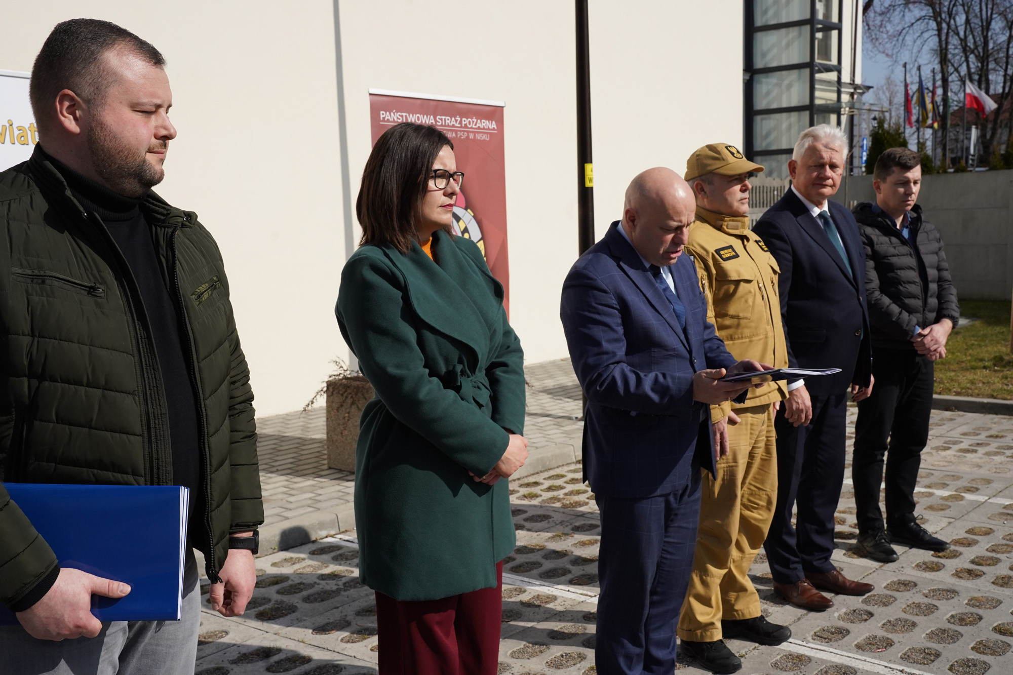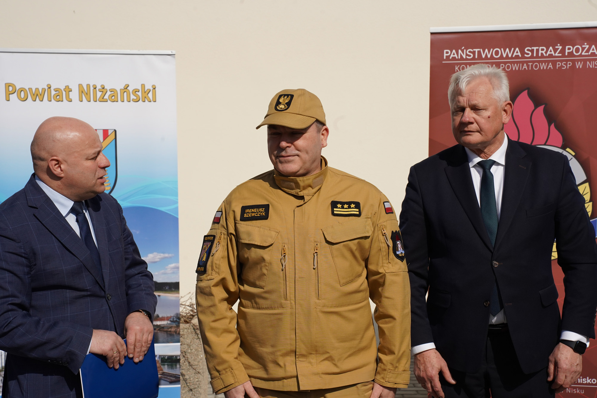 W uroczystym przekazaniu sprzętu udział wzięli Starosta Niżański Robert Bednarz, Wicestarosta Józef Sroka, Zastępca Komendanta Powiatowego Państwowej Straży Pożarnej w Nisku st. bryg. Ireneusz Szewczyk, Radna Rady Powiatu Niżańskiego Justyna Delekta oraz pracownicy Wydziału Organizacji, Spraw Obronnych i Zarządzania Kryzysowego Starostwa Powiatowego w Nisku.