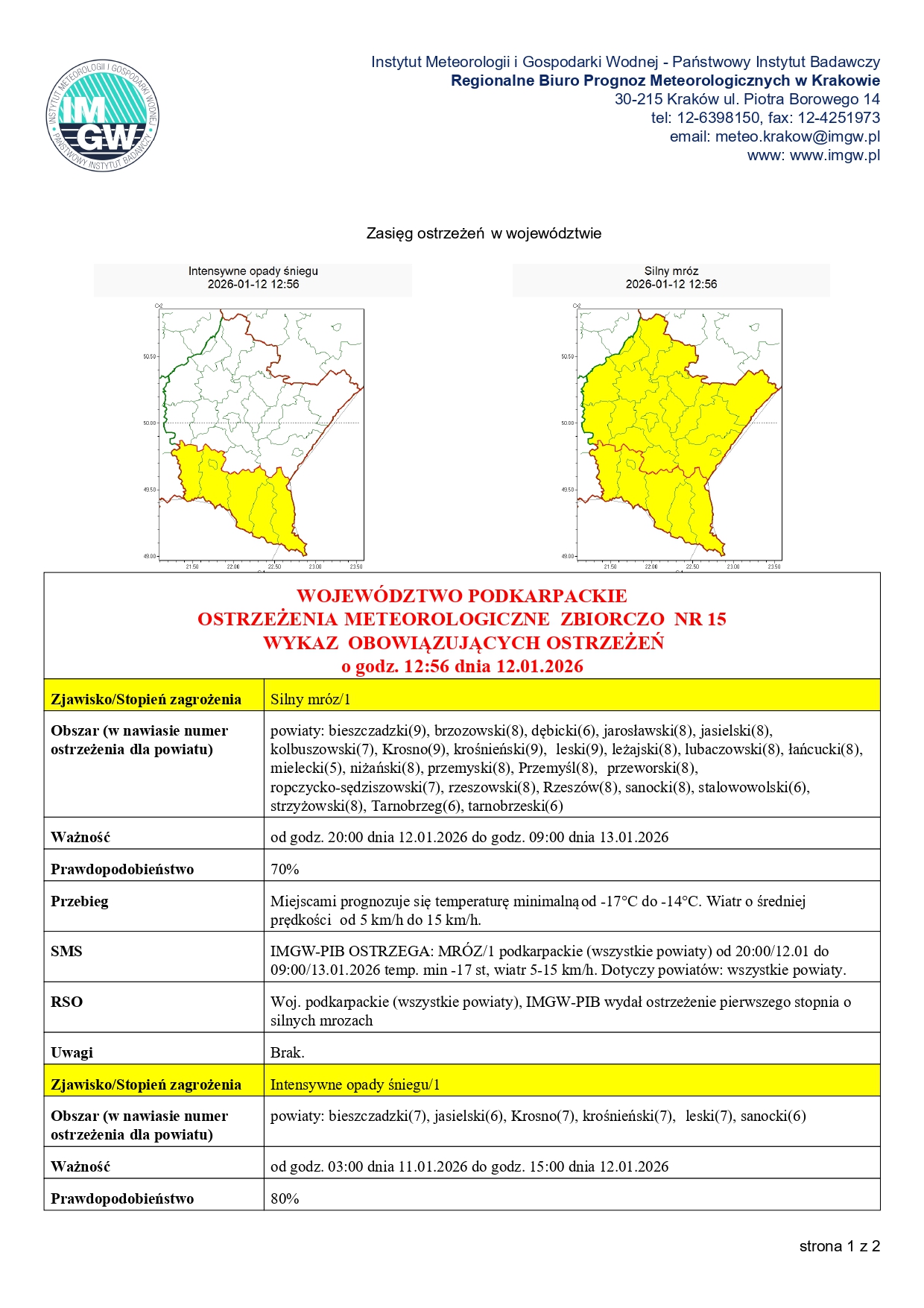 Powiatowe Centrum Zarządzania Kryzysowego w Nisku informuje, że od godz. 20:00 dnia 12.01.2026 do godz. 9:00 dnia 13.01.2026, na terenie powiatu niżańskiego miejscami prognozuje się temperaturę minimalną od -17°C do -14°C. Wiatr o średniej prędkości od 5 km/h do 15 km/h.