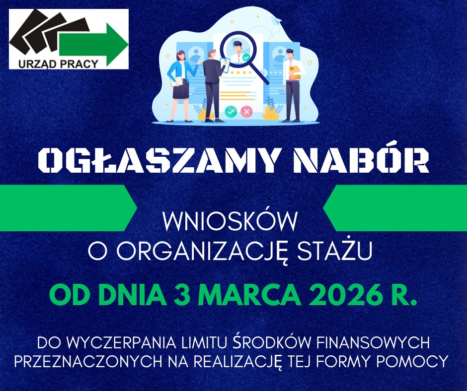 Starostwo Powiatowe w Nisku informuje, że Powiatowy Urząd Pracy w Nisku ogłosił nabór wniosków o organizację stażu w ramach środków z Funduszu Pracy (tzw. Algorytm) dla 35 osób bezrobotnych zarejestrowanych w PUP Nisko. Przewidywany okres organizacji stażu w ramach naboru wynosi do 4 miesięcy.