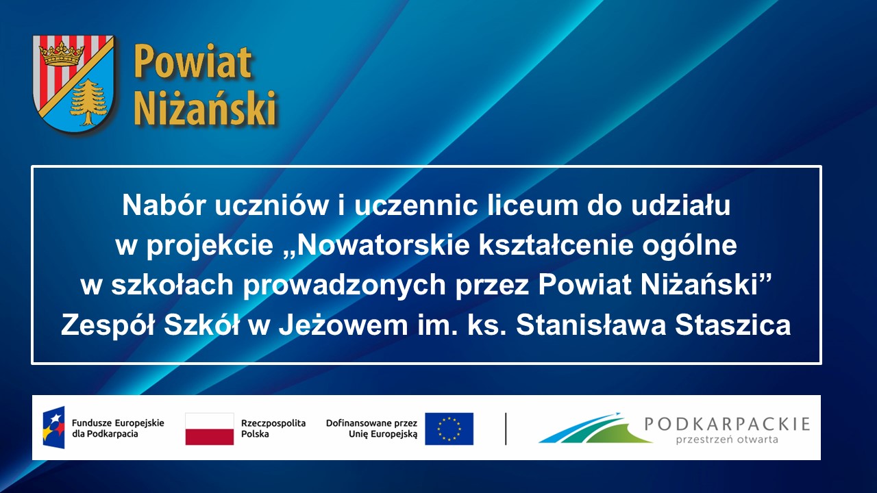 Powiat Niżański wraz z Liceum Ogólnokształcącym w Zespole Szkół w Jeżowem im. ks. Stanisława Staszica z przyjemnością informują, iż rozpoczęto nabór uczniów i uczennic do udziału w projekcie „Nowatorskie kształcenie ogólne w szkołach prowadzonych przez Powiat Niżański”.