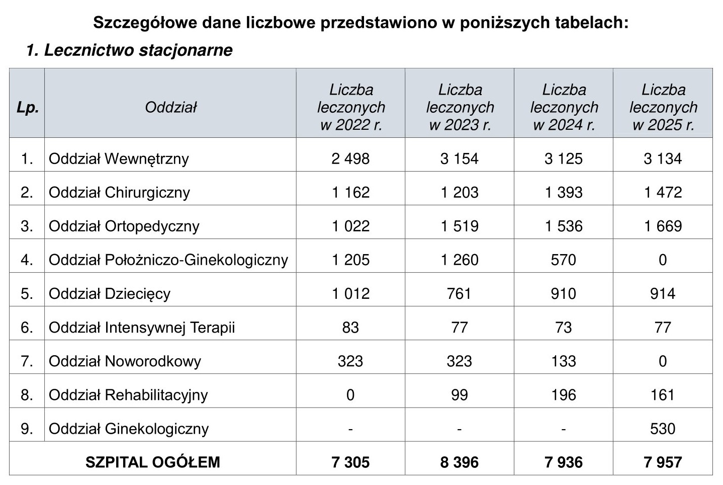 W 2025 roku w SPZZOZ w Nisku hospitalizowano 7 957 pacjentów w ramach lecznictwa stacjonarnego, udzielono 76 546 porad lekarskich w Poradniach Specjalistycznych oraz