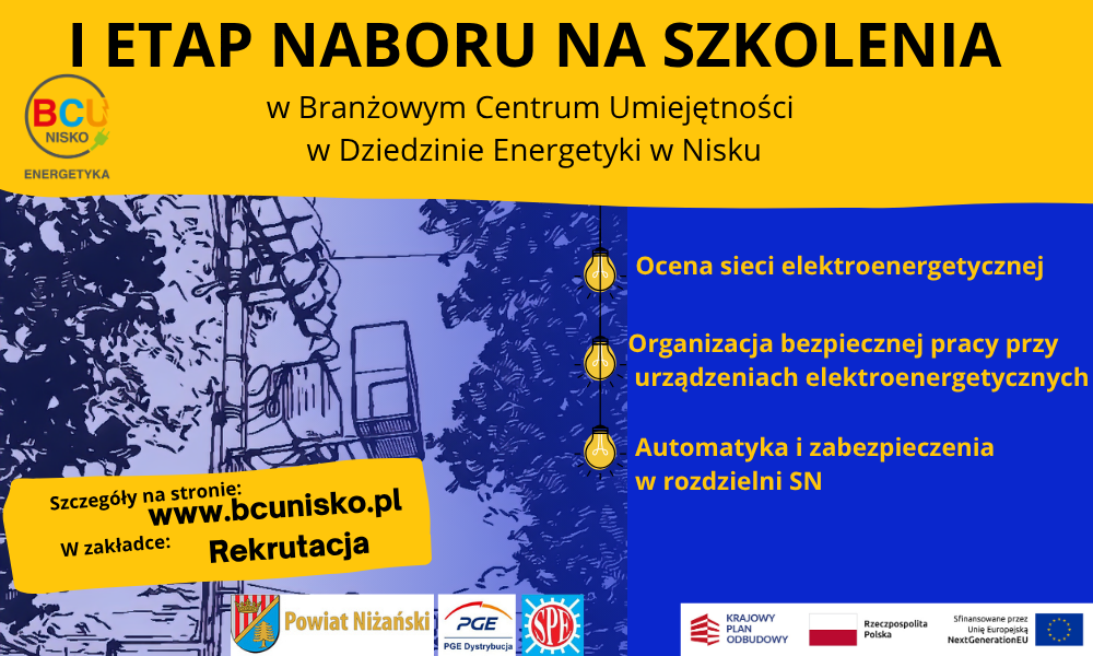 Powiat Niżański informuje, że Branżowe Centrum Umiejętności w Dziedzinie Energetyki w Nisku (BCU) rozpoczęło nabór uczestników na pierwsze trzy szkolenia