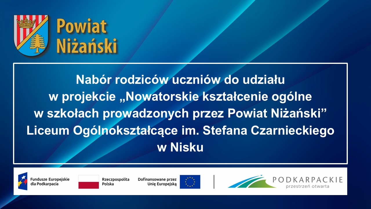 NABÓR RODZICÓW / OPIEKUNÓW PRAWNYCH DO UDZIAŁU W PROJEKCIE „NOWATORSKIE KSZTAŁCENIE OGÓLNE W SZKOŁACH PROWADZONYCH PRZEZ POWIAT NIŻAŃSKI” LICEUM OGÓLNOKSZTAŁCĄCE IM. STEFANA CZARNIECKIEGO W NISKU