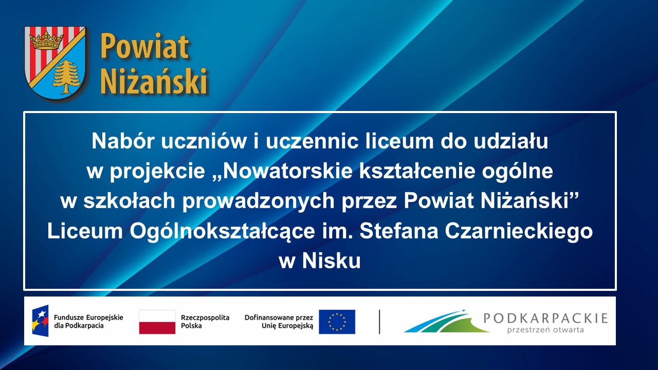 Powiat Niżański wraz z Liceum Ogólnokształcącym im. Stefana Czarnieckiego w Nisku z przyjemnością informują, iż rozpoczęto nabór uczniów i uczennic Liceum Ogólnokształcącego im. Stefana Czarnieckiego w Nisku do udziału w projekcie „Nowatorskie kształcenie ogólne w szkołach prowadzonych przez Powiat Niżański”.