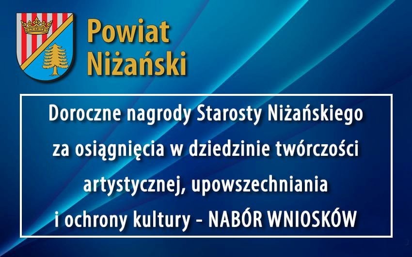 Informujemy, że w sprawie ustanowienia i przyznawania dorocznych nagród Starosty Niżańskiego za osiągnięcia w dziedzinie twórczości artystycznej, upowszechniania i ochrony kultury, do dnia 31 marca 2026 r. można składać wnioski o przyznanie dorocznej nagrody Starosty Niżańskiego za osiągnięcia w dziedzinie twórczości artystycznej, upowszechniania i ochrony kultury.