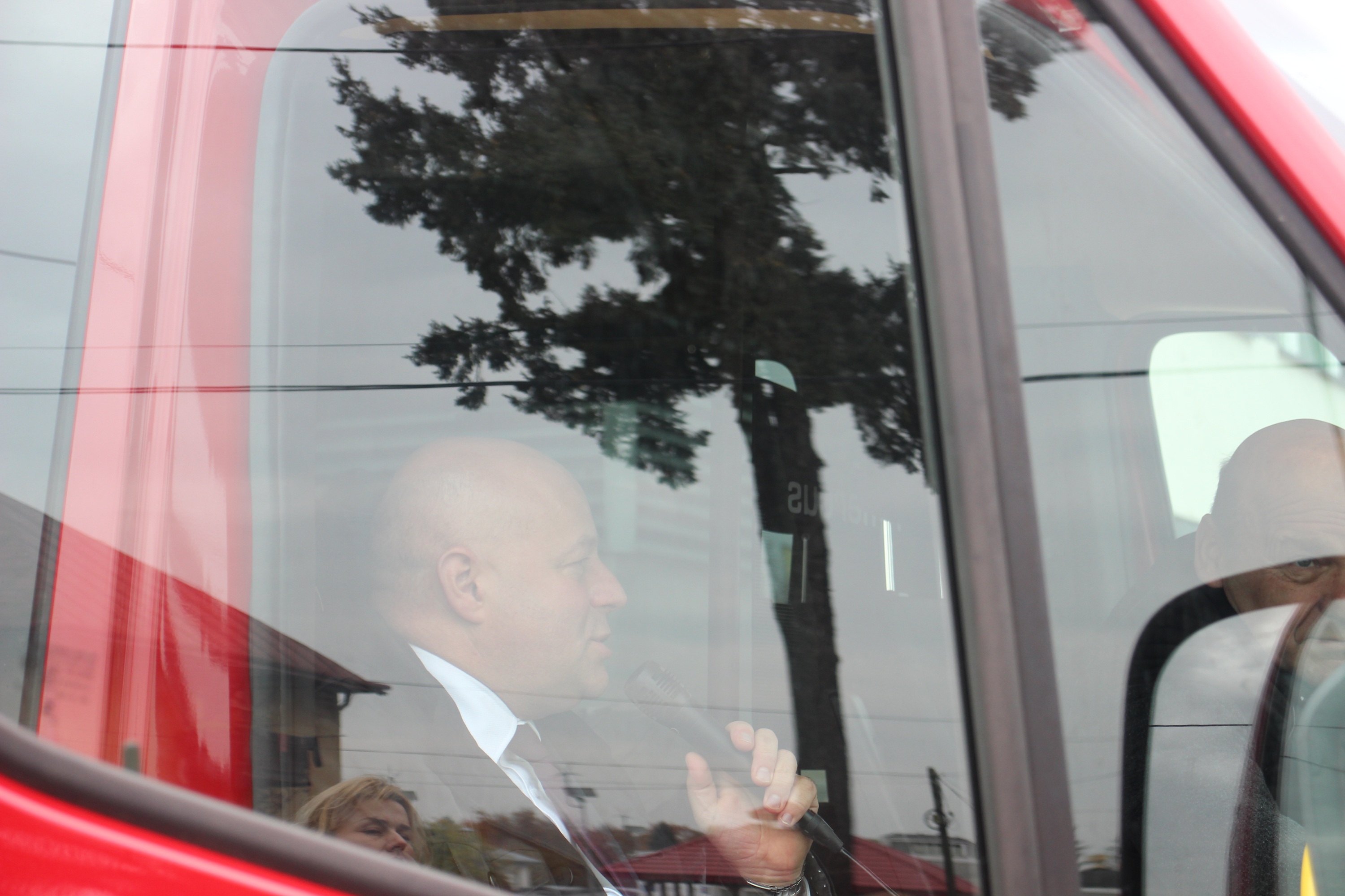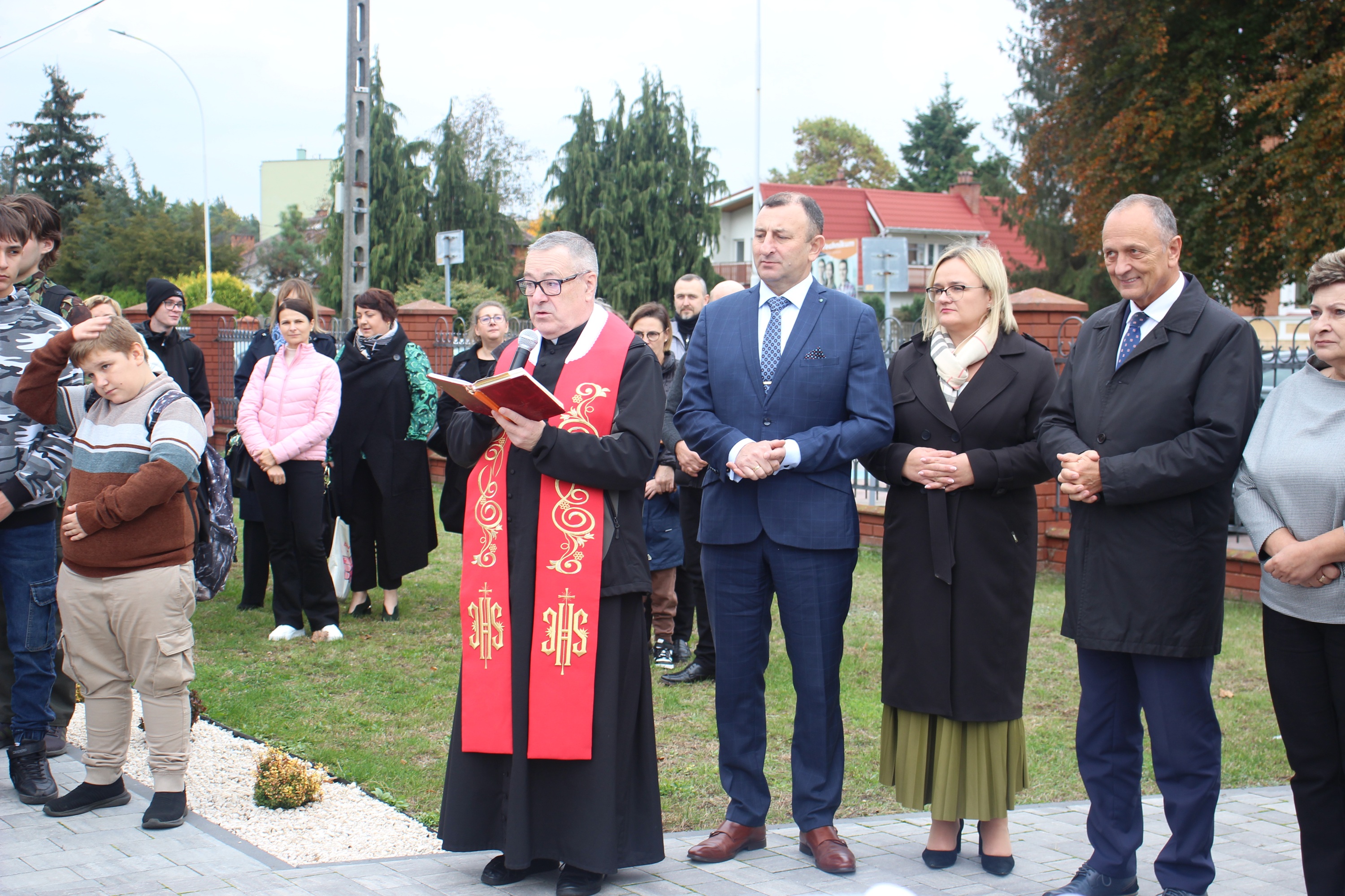 Po oficjalnej części uroczystości, wszyscy uczestnicy udali się na zewnątrz, gdzie pojazd został uroczyście poświęcony przez Księdza Proboszcza Stanisława Czachora, a następnie zgromadzeni mogli podziwiać wyposażenie autobusu.