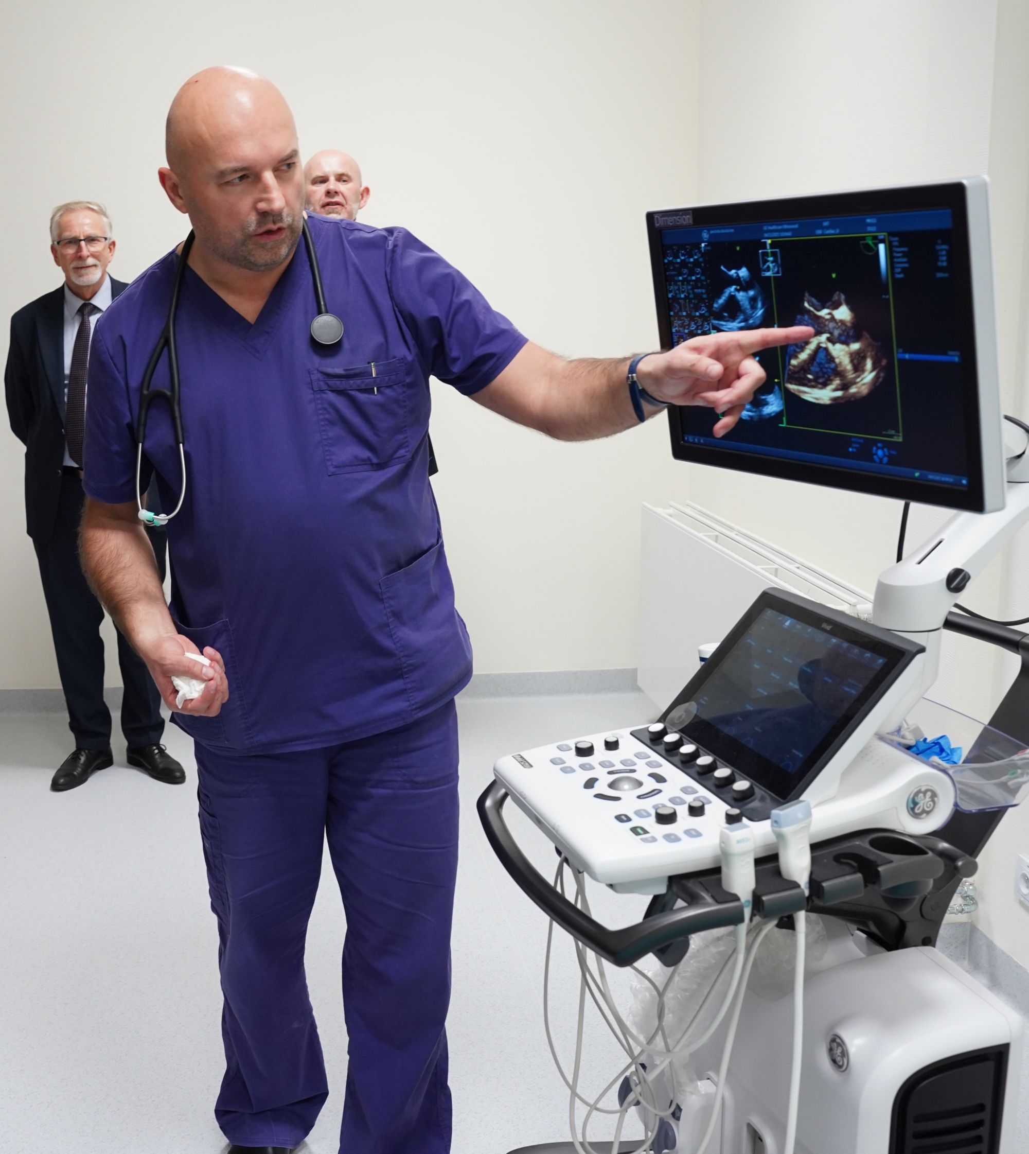 Nowo otwarty Pododdział Kardiologiczny, kierowany przez dr Radosława Krawczykiewicza i wyremontowana Sala Intensywnego Nadzoru Kardiologicznego to również ważne i znaczące przedsięwzięcie, potrzebne w szczególności dla pacjentów z problemami kardiologicznymi. Szpital posiada na wyposażeniu nowoczesny aparat ultrasonograficzny wyposażony w sondę przezprzełykową co stanowi ważny krok w podniesieniu jakości diagnostyki i leczenia pacjentów w naszym szpitalu. Aparat z sondą przezprzełykową ma szczególne znaczenie w pracy Pododdziału Kardiologicznego, gdzie pozwala na szybką ocenę przyczyn niestabilności hemodynamicznej pacjentów w stanie krytycznym, wykrywanie zatorów, skrzeplin i patologii zastawek serca, prowadzenie bezpiecznej terapii płynowej i oceny wydolności układu krążenia i diagnostykę wad serca, infekcyjnego zapalenia wsierdzia czy tętniaków aorty. Dzięki nowemu aparatowi z sondą przezprzełykową możliwe będzie wykonywanie zaawansowanych badań w trybie natychmiastowym, bez konieczności transportu pacjentów do innych ośrodków, co znacząco skróci czas diagnostyki i poprawi bezpieczeństwo chorych.