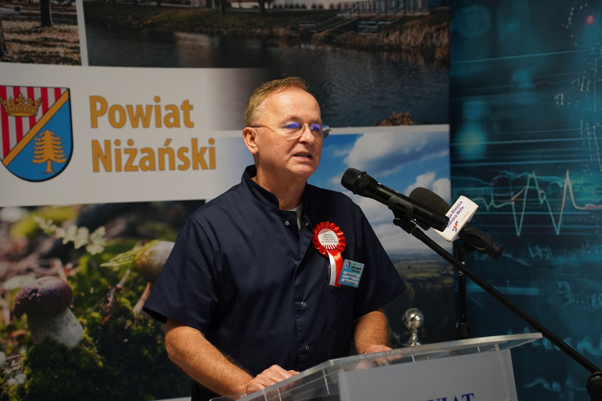 Następnie głos zabrał Starosta Niżański Robert Bednarz, który w swojej wypowiedzi odniósł się do aktualnej, wymagającej sytuacji w systemie ochrony zdrowia. Podkreślił, że funkcjonowanie szpitali powiatowych w całej Polsce wiąże się dziś z wieloma wyzwaniami – zarówno finansowymi, jak i organizacyjnymi – wynikającymi m.in. z rosnących kosztów działalności, niedoborów kadrowych oraz zmieniających się uwarunkowań systemowych.