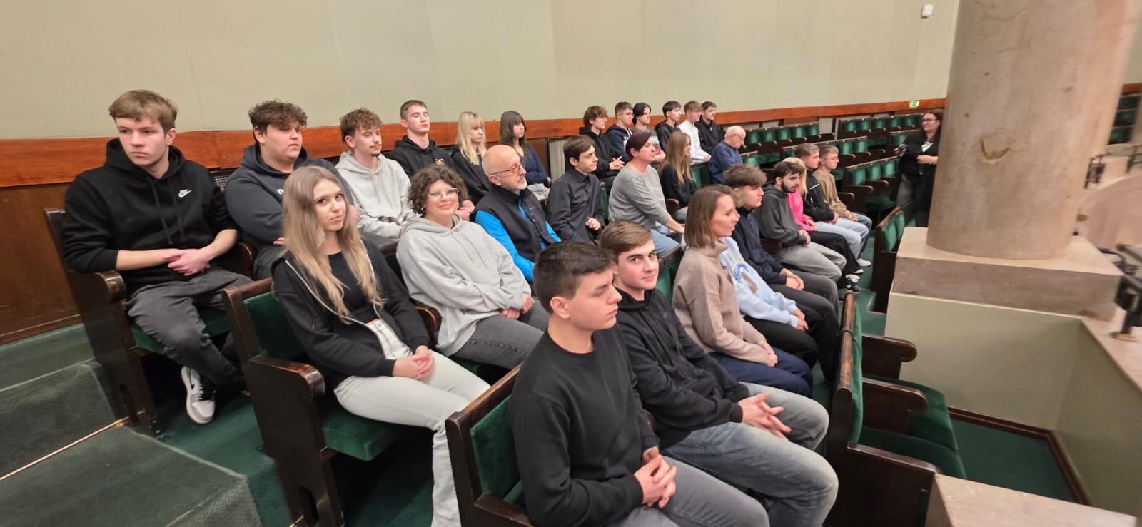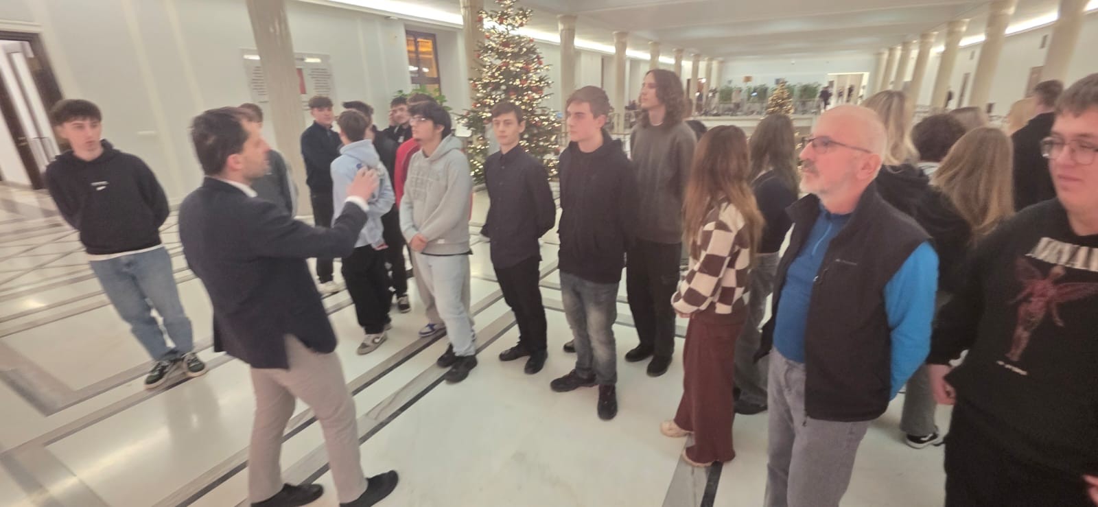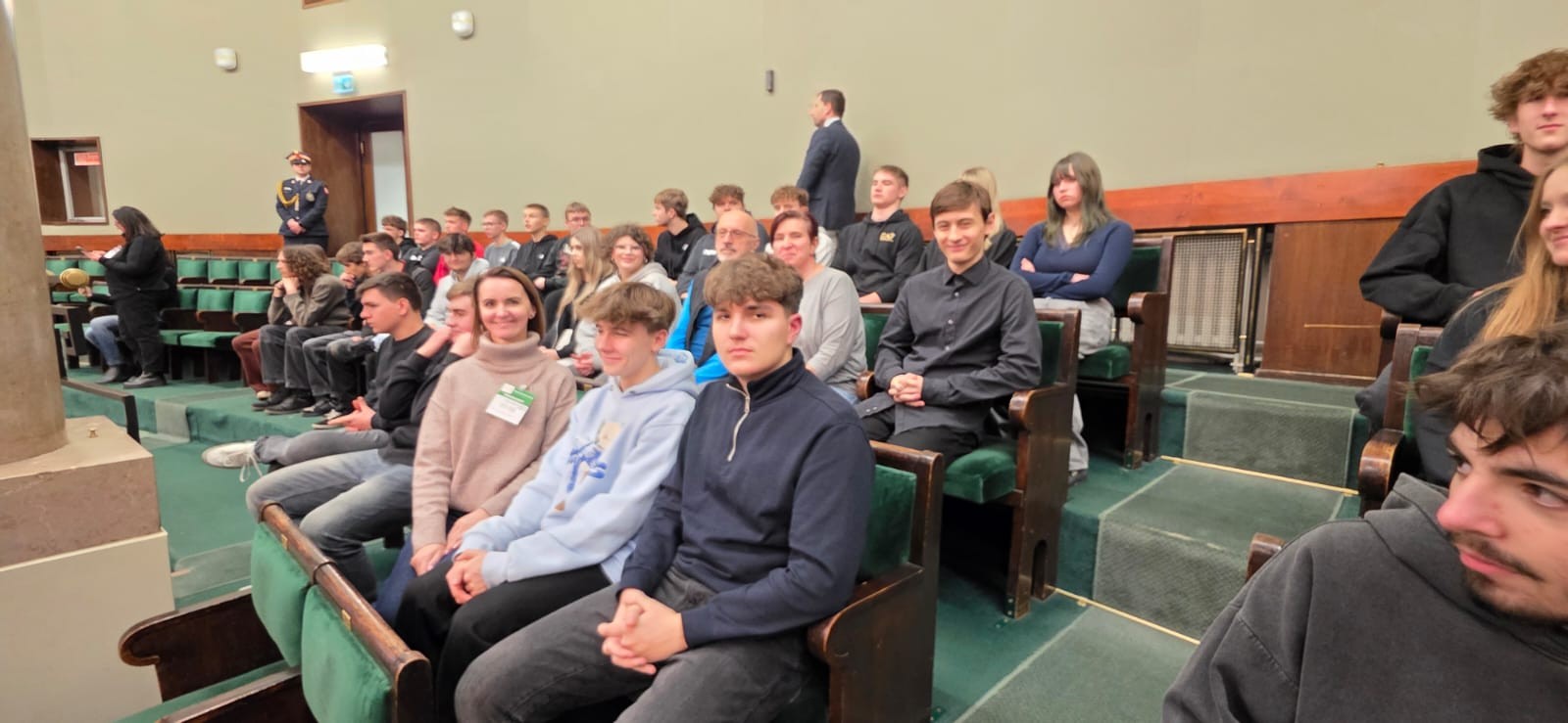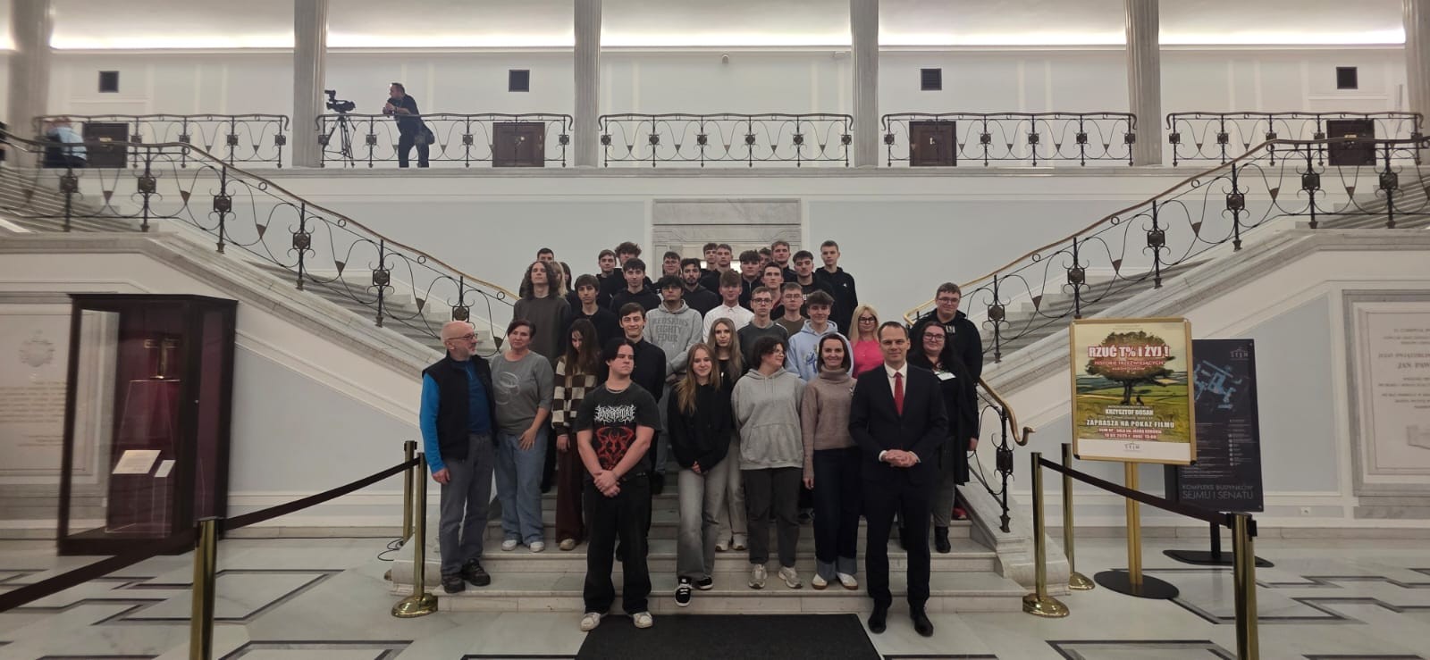 Ostatnim punktem programu była wizyta w Sejmie Rzeczypospolitej Polskiej. W murach parlamentu uczestników wyjazdu powitał Poseł na Sejm RP Rafał Weber, który towarzyszył zebranym w czasie zwiedzania oraz opowiedział o codziennej pracy posła. Podczas wizyty uczniowie dowiedzieli się jak powstają ustawy oraz jakie znaczenie ma parlament w demokratycznym państwie. Bezpośrednie zobaczenie sali obrad zrobiło na wszystkich duże wrażenie, tym bardziej, że młodzież została powitana na sali obrad przez wicemarszałek Dorotę Niedzielę.