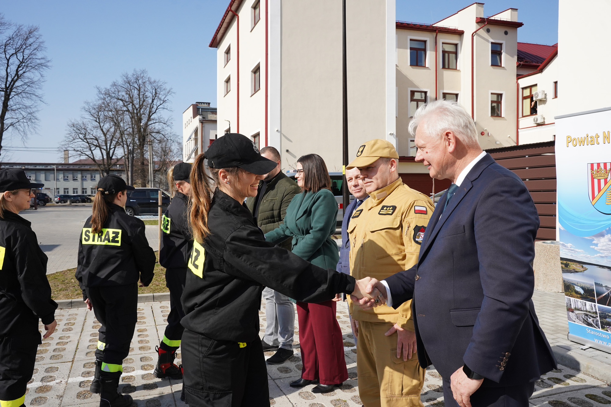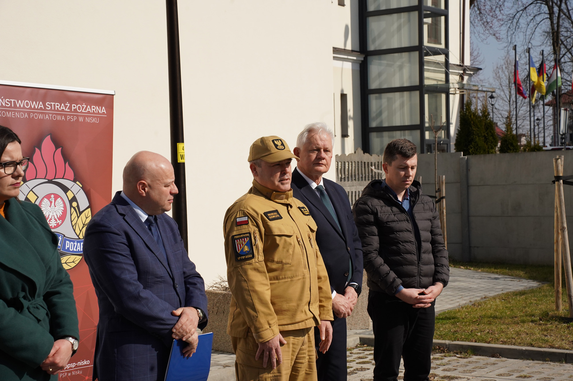 W uroczystym przekazaniu sprzętu udział wzięli Starosta Niżański Robert Bednarz, Wicestarosta Józef Sroka, Zastępca Komendanta Powiatowego Państwowej Straży Pożarnej w Nisku st. bryg. Ireneusz Szewczyk, Radna Rady Powiatu Niżańskiego Justyna Delekta oraz pracownicy Wydziału Organizacji, Spraw Obronnych i Zarządzania Kryzysowego Starostwa Powiatowego w Nisku.