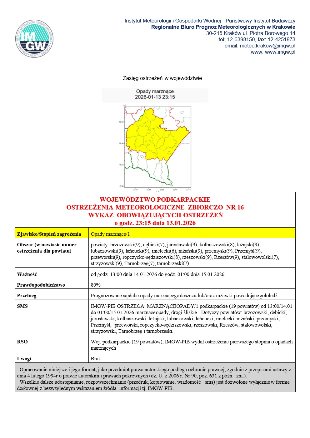 Powiatowe Centrum Zarządzania Kryzysowego w Nisku informuje, że od godz. 13:00 dnia 14.01.2026 do godz. 01:00 dnia 15.01.2026, na terenie powiatu niżańskiego prognozowane są słabe opady marznącego deszczu lub mżawki powodujące gołoledź.