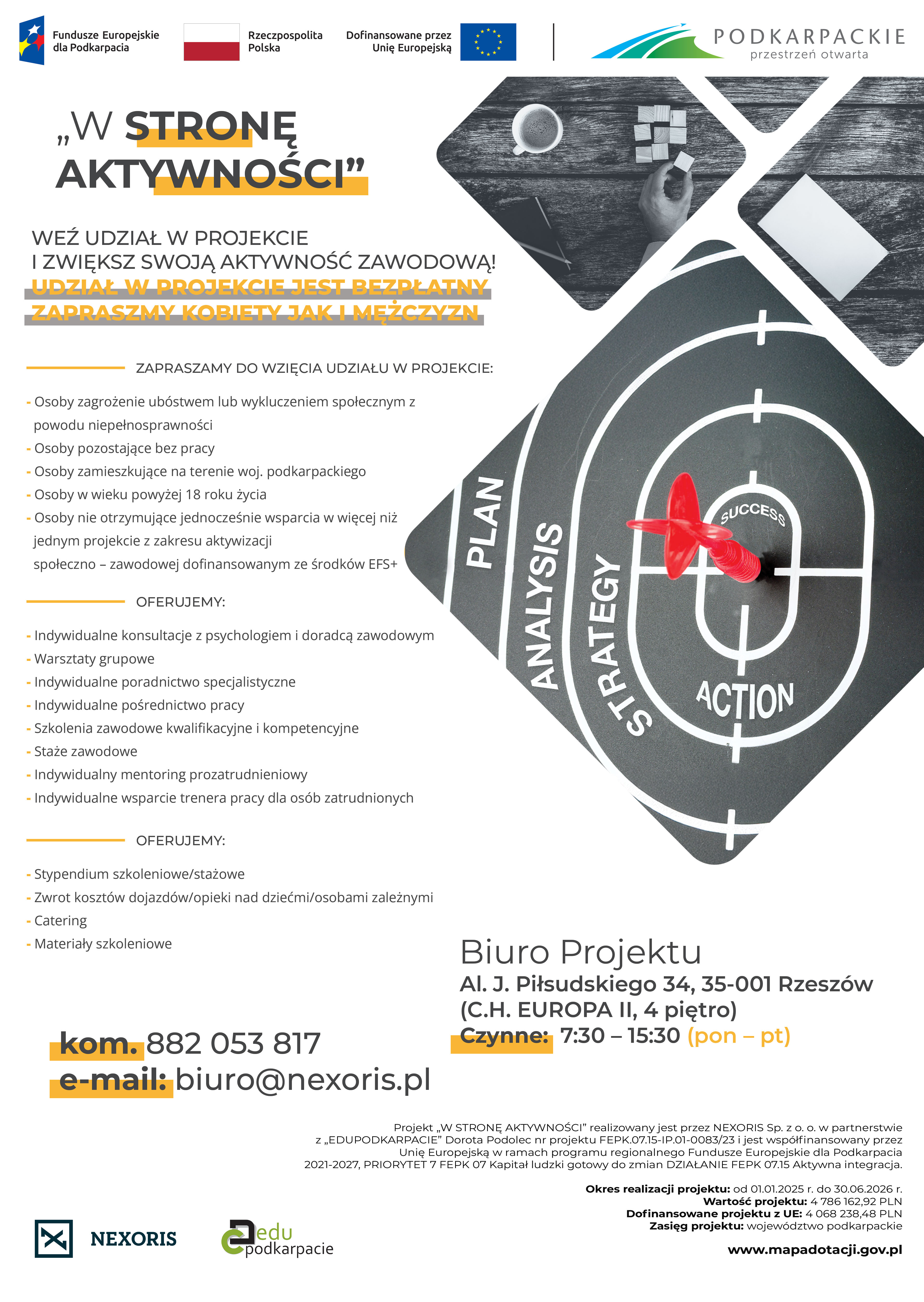 NEXORIS Sp. z o.o. prowadzi rekrutację do projektu „W STRONĘ AKTYWNOŚCI”, realizowanego w ramach Programu Fundusze Europejskie dla Podkarpacia 2021–2027.
