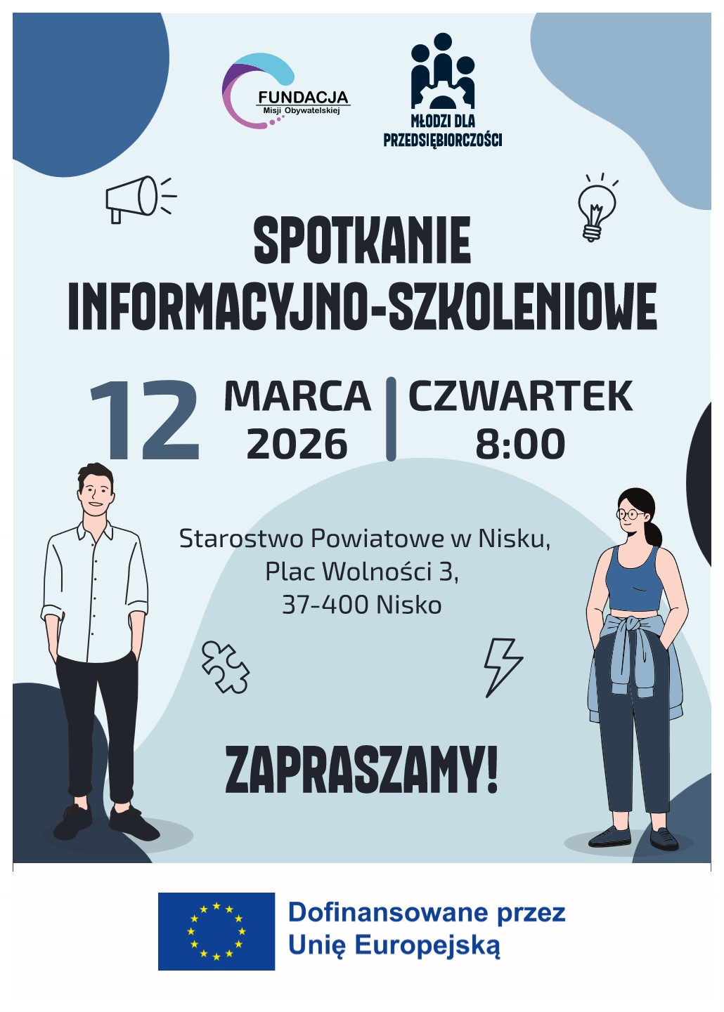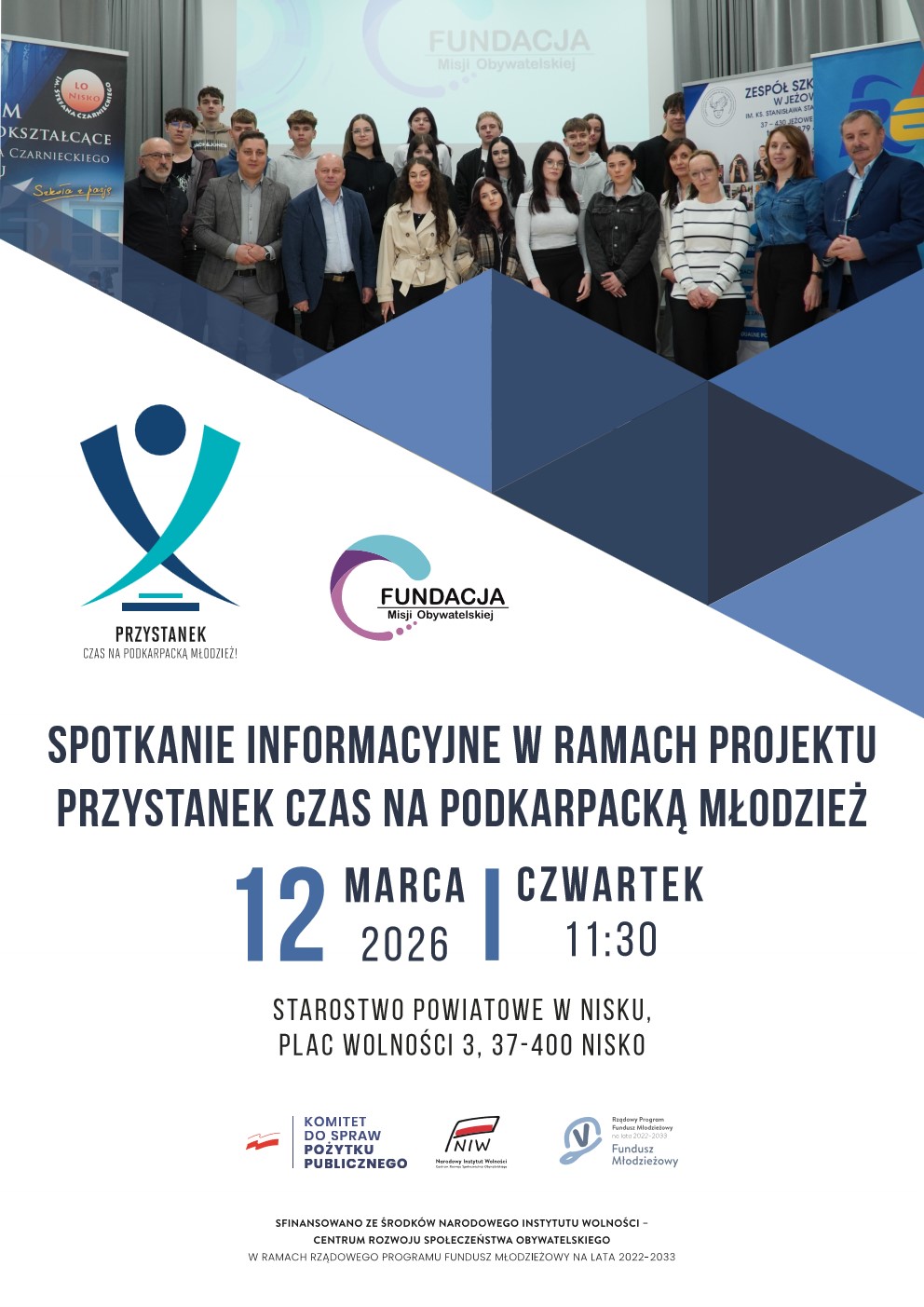 Fundacja Misji Obywatelskiej zaprasza młodzież z Powiatu Niżańskiego na spotkanie informacyjno-szkoleniowe w ramach projektu „Młodzi dla Przedsiębiorczości” finansowanego ze środków Unii Europejskiej w programie Erasmus+ oraz „Przystanek – Czas na Podkarpacką Młodzież! Edycja 2024-2026” finansowanego ze środków Narodowego Instytutu Wolności – Centrum Rozwoju Społeczeństwa Obywatelskiego w ramach Rządowego Programu Fundusz Młodzieżowy na lata 2022-2033, które odbędzie się 12 marca 2026 r. (czwartek) w Auli przy Liceum Ogólnokształcącym im. Stefana Czarnieckiego w Nisku w godzinach 8:00 i 11:30.