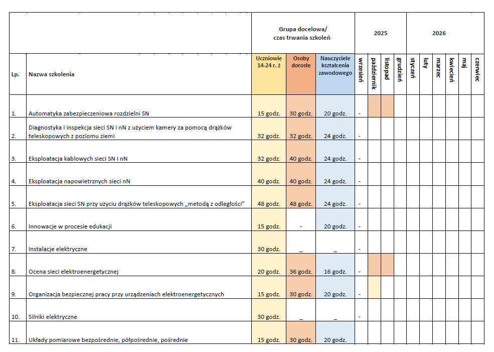 - Organizacja bezpiecznej pracy przy urządzeniach elektroenergetycznych — grupa docelowa: osoby młode/uczniowie/studenci (w wieku 14–24 lata); czas trwania: 15 godzin