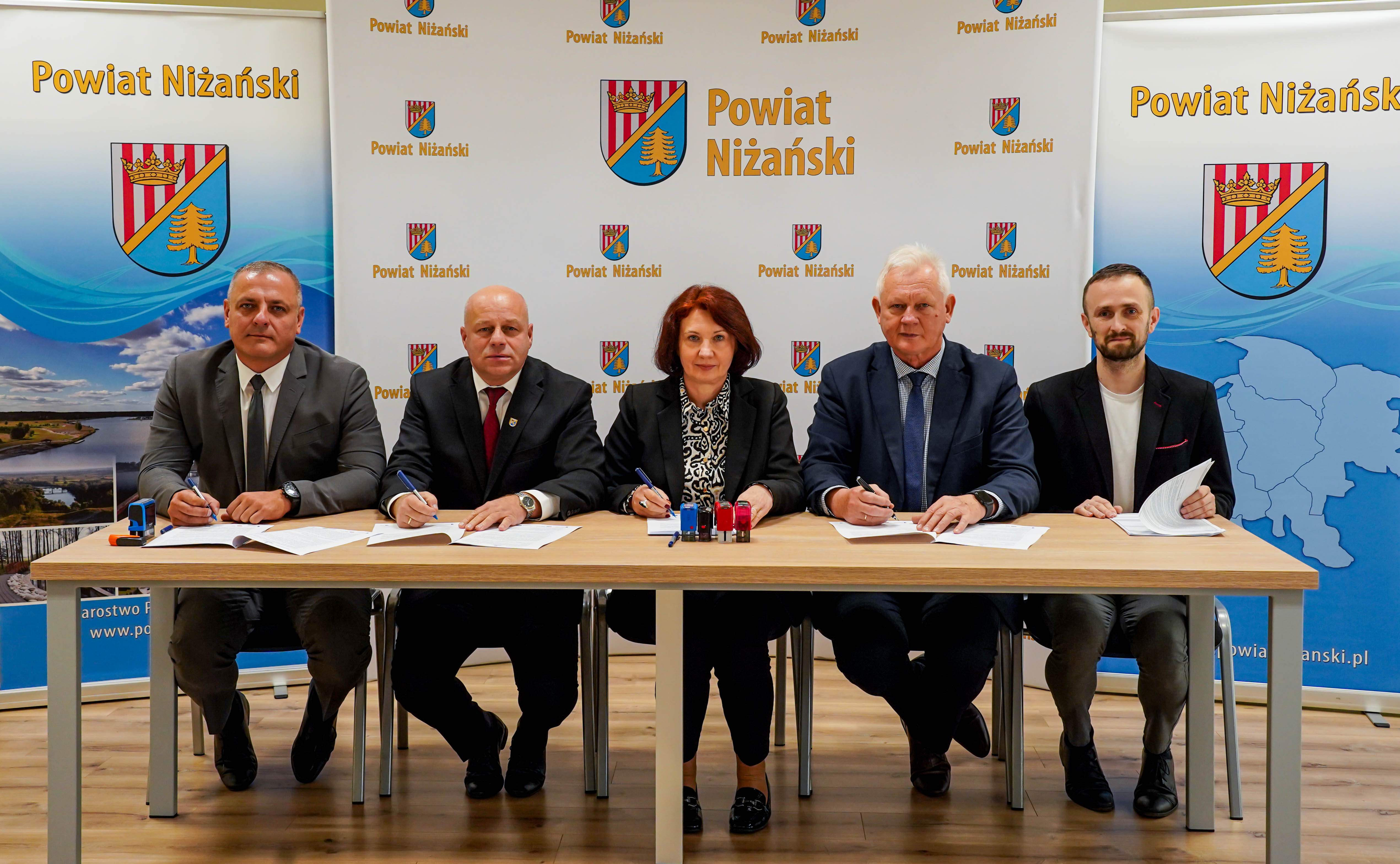 Umowę na realizację powyższego zadania podpisali Starosta Niżański Robert Bednarz i Wicestarosta Józef Sroka przy kontrasygnacie Skarbnika Powiatu Marii Bednarz oraz Przemysław Żyndul – pełnomocnik Wykonawcy, w obecności Głównego specjalisty ds. Informatyki w Wydziale Organizacji, Spraw Obronnych i Zarządzania Kryzysowego Jarosława Zalewskiego.